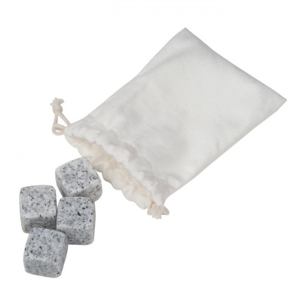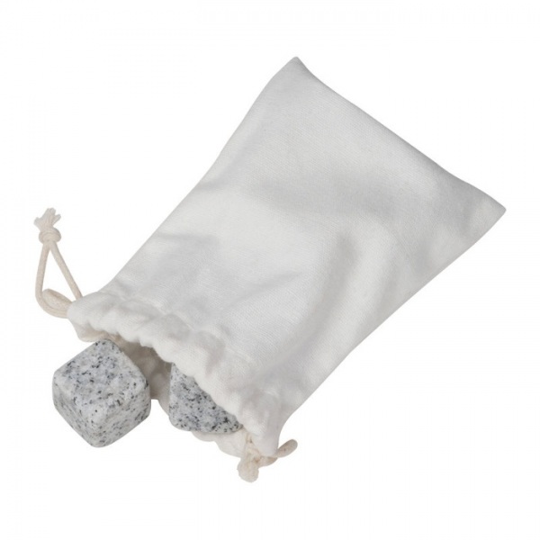 Sada 4 svetlých ľadových kamenných kociek zabalených v prírodnej bavlnenej taške. Opakovane použiteľné a ideálne na chladenie nápojov. Elegantná alternatíva za tradičné kocky ľadu!