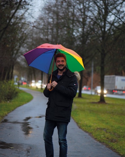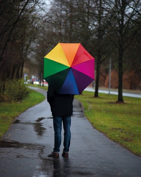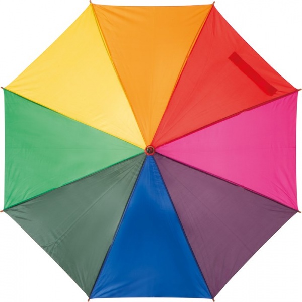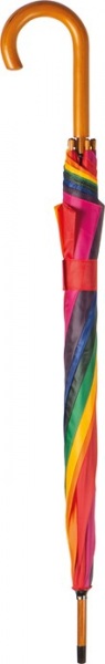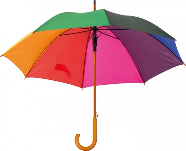 Viacfarebný automatický dáždnik s drevenou rukoväťou. Priemer dáždnika 105cm.