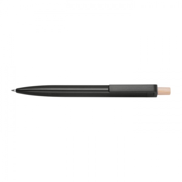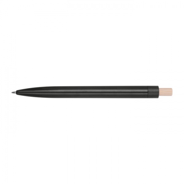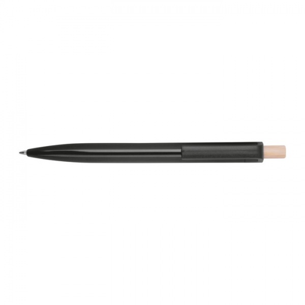 Guľôčkové pero vyrobené z recyklovaného ABS s tlačidlom z bambusu. Obsahuje modrú plastovú náplň.