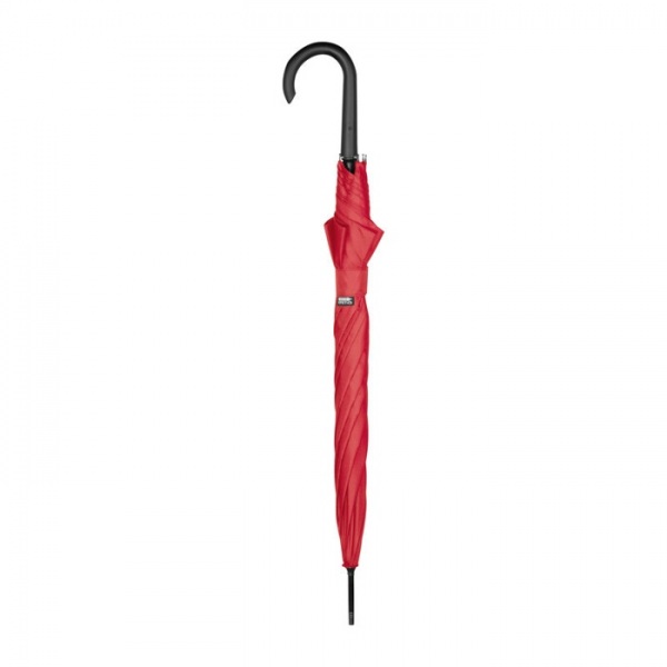 Automatický vetruodolný dáždnik z 190T recyklovaného polyesteru s ohnutou rukoväťou z ABS plastu a kovovými špicami.