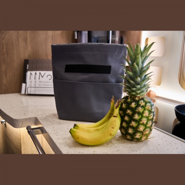 Chladiaca taška z recyklovanej bavlny a recyklovaného polyesteru. Taška má nosný popruh, široké suché zipsové zapínanie a predné vrecko.