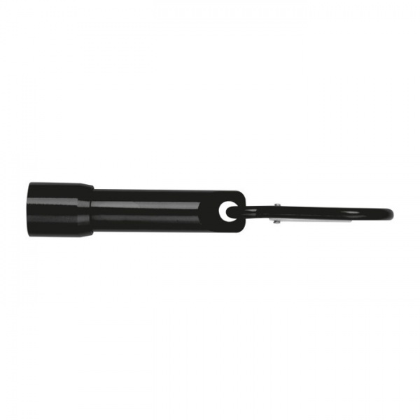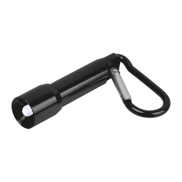 Mini baterka s karabínou z recyklovaného hliníka. Súčasťou balenia sú 4 gombíkové batérie.