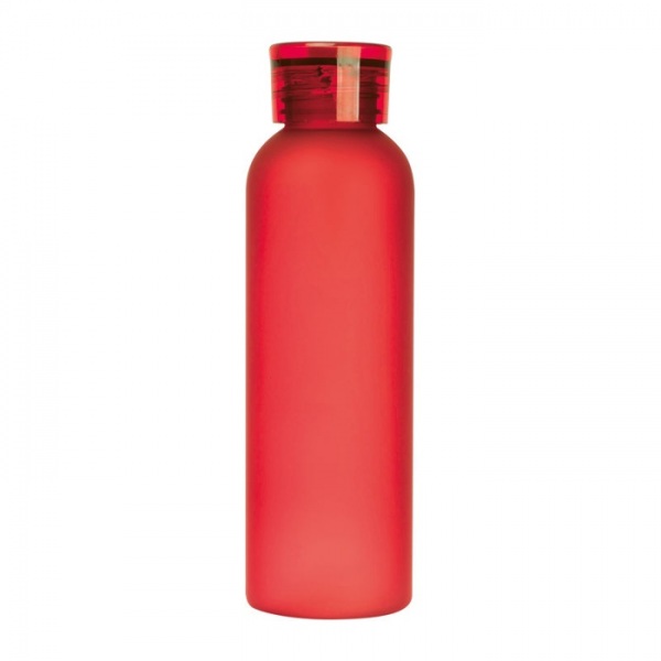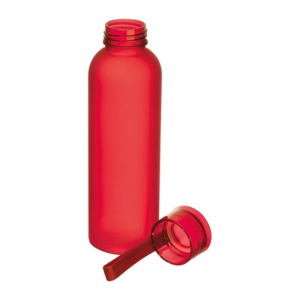 Fľaša na pitie z PET materiálu s gumovým držadlom na viečku a objemom 600 ml. Matná povrchová úprava fľaše.