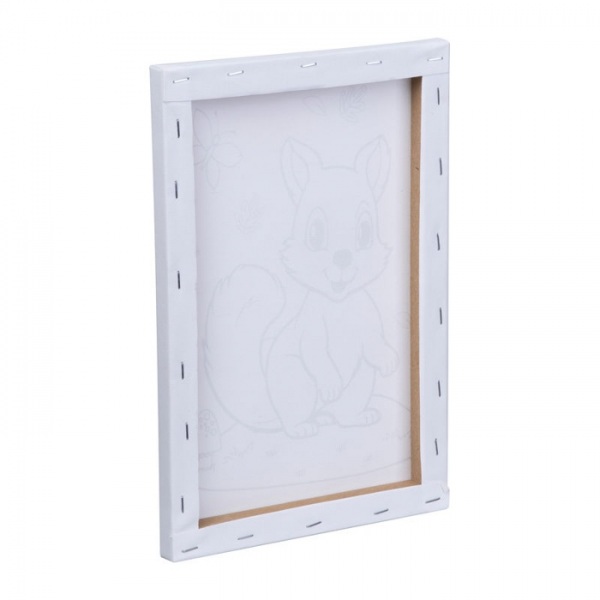 Plátno s dreveným rámom zdobené motívom veveričky na vymaľovanie. Súprava obsahuje päť rôznych farieb na maľovanie - čiernu, červenú, oranžovú, žltú a zelenú.