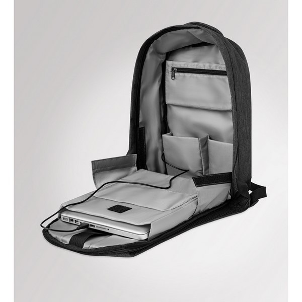 Dvojfarebný ruksak proti krádeži zo 600D polyesteru so zosilnenými popruhmi s jedným hlavným vnútorným priečinkom s vreckom na 13" notebook a USB nabíjacím káblom.