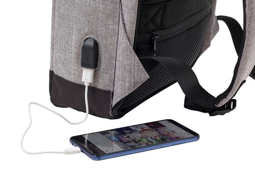 Ruksak má priečinok na 13" notebook, vnútorné vrecká vrátane predného vrecka na zips. Na boku ruksaku sa nachádza USB port s káblom na vnútornej strane.