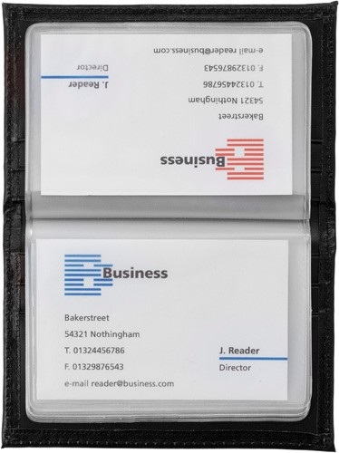 Vizitkár z lepenej kože, obsahuje miesto až pre 20 vizitiek. Na vnútornej strane sú ďalšie 4 vrecká na kreditné karty.