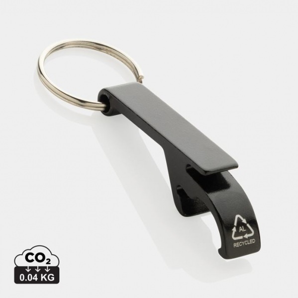 Kľúčenka s otváračom na fľaše a plechovky. RCS certifikácia zaisťuje garanciu použitia recyklovaného materiálu vďaka transparentnému prehľadu nad dodávateľským reťazcom. Podiel recyklátu: 79 %. Balené v papierovom obale.
