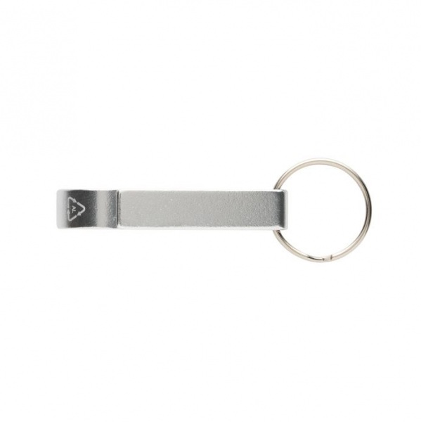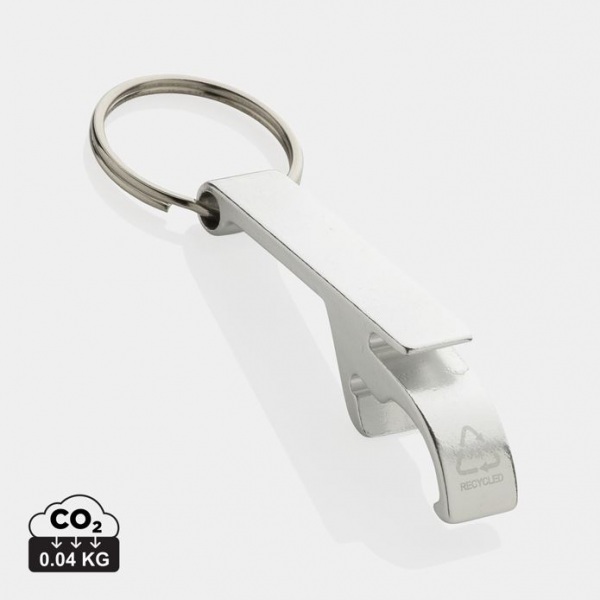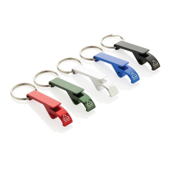 Kľúčenka s otváračom na fľaše a plechovky. RCS certifikácia zaisťuje garanciu použitia recyklovaného materiálu vďaka transparentnému prehľadu nad dodávateľským reťazcom. Podiel recyklátu: 79 %. Balené v papierovom obale.