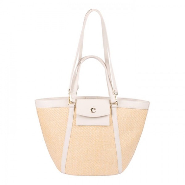 Kabelka "Alesia" sleduje trend prútených tašiek. Malá vnútorná priehradka na zips v podšívke podobnej bavlne. Lemy sú vyrobené z vegánskej kože. Dodávajú sa s popruhom, takže tašku je možné nosiť na ramene alebo ako crossbody.