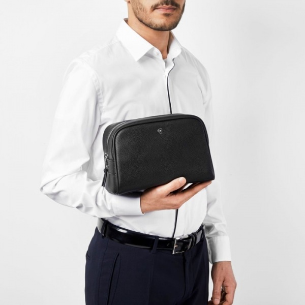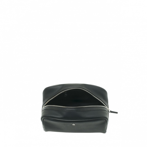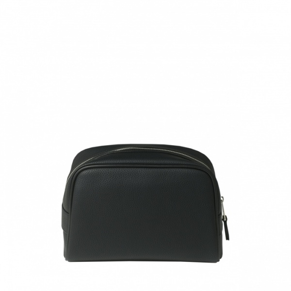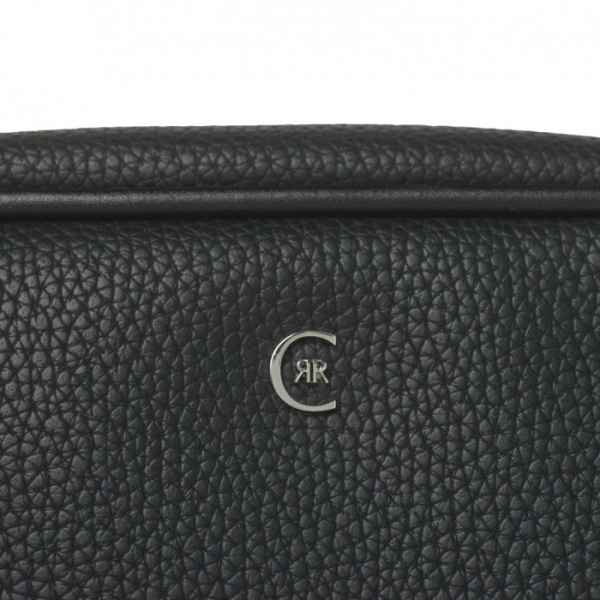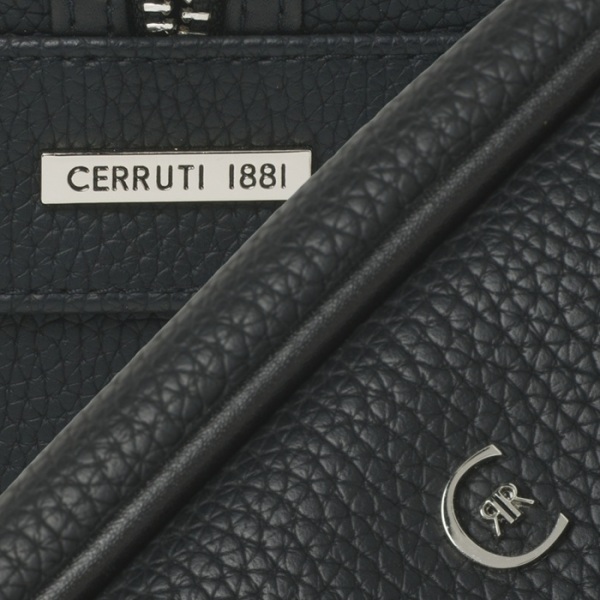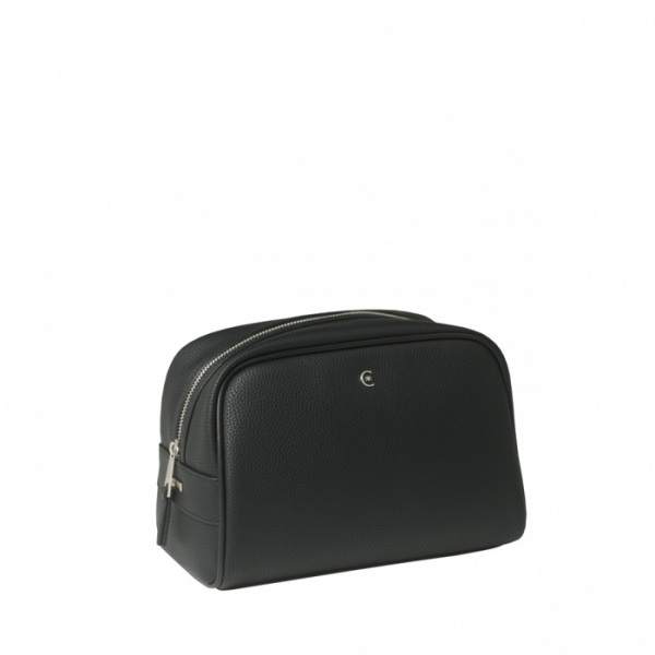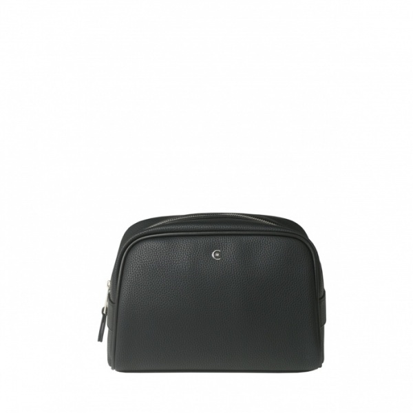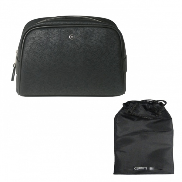Toaletná taška Hamilton s čiernou imitáciou jemnej zrnitej kože a vysokokvalitnou nylonovou podšívkou. Výrazný chrómovaný monogram na prednej časti vrecka. Na bočnej časti je pochrómovaný štítok s logom CERRUTI 1881. Zipsy sú ukončené chrómom.