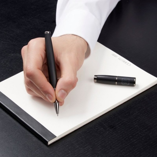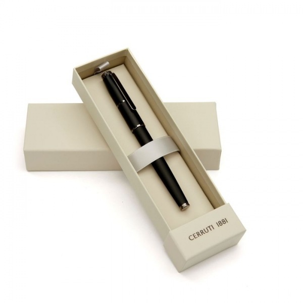 Diamantom gravírovaný povrch dodáva extra nádych luxusu. Logo CRR je jemne vytlačené v tmavosivej farbe tón v tóne. Čierna náplň. Darčeková krabička Cerruti.
