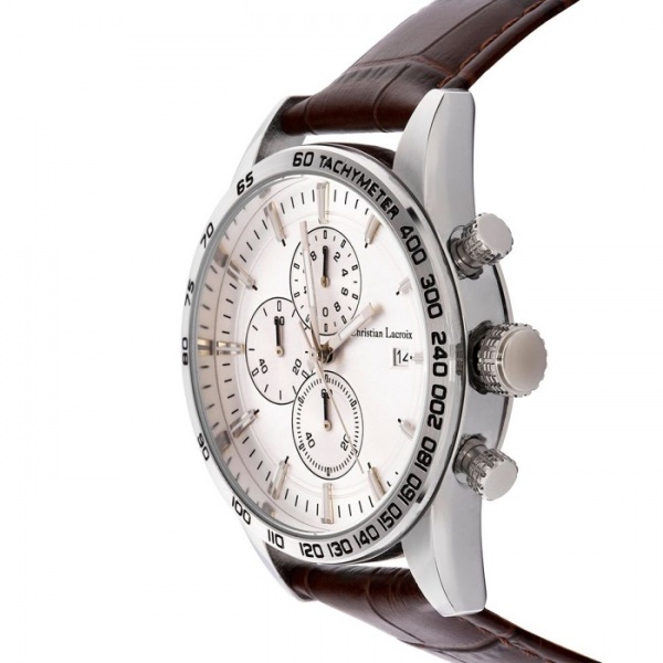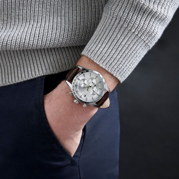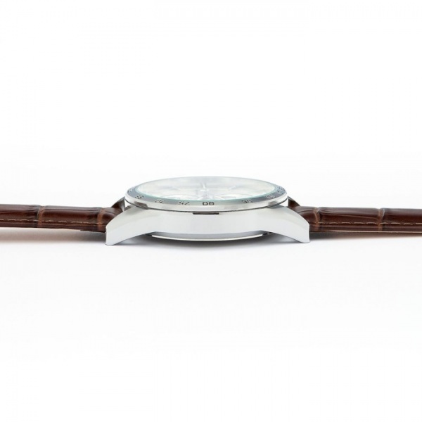 Tieto hodinky sa môžu pochváliť elegantným dizajnom s čiernym remienkom z pravej kože, chrómovým puzdrom a nápadným slnečným ciferníkom. Vodeodolnosť 3 ATM.