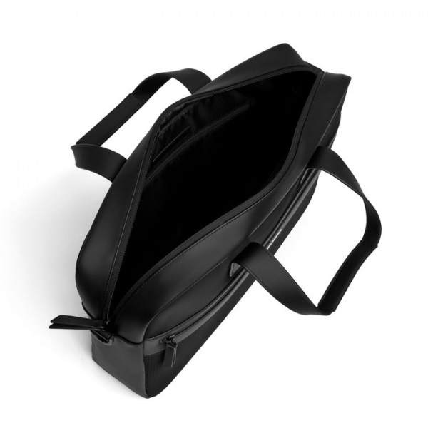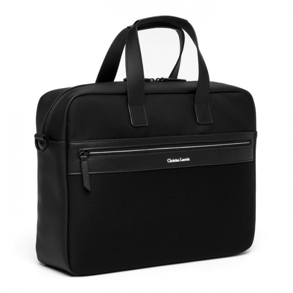 Spojenie nylonu, sieťoviny a hladkého PU. Kontrastné biele detaily zipsu – obrátený biely zips vytvára efekt „bielej línie“. Logo Christian Lacroix vyhotovené v bielom TPU ladí s detailom zipsu. Vnútro má podšívku s monogramom. Priehradka na notebook.