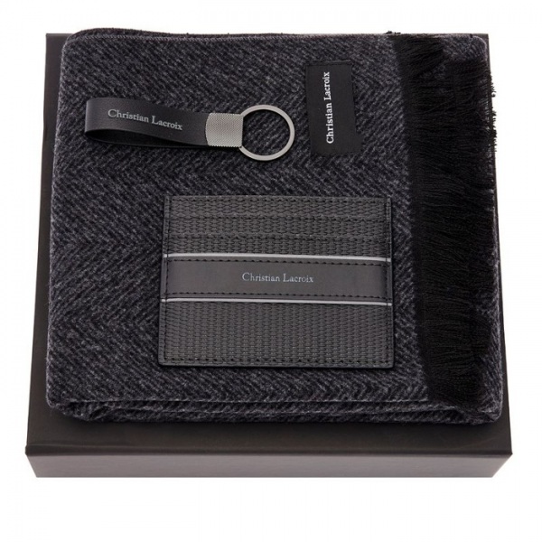 Pánska sada v darčekovom balení obsahuje šál (180 x 35 cm), kľúčenku a obal na karty.