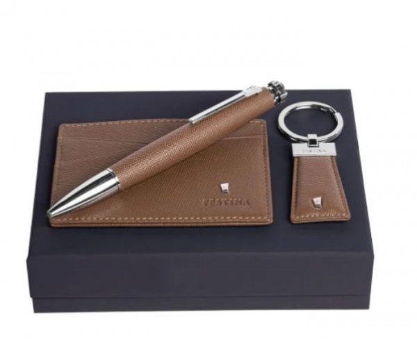 Pánska sada v darčekovom balení obsahuje guľôčkové pero (čierna náplň), kľúčenku a peňaženku na karty.