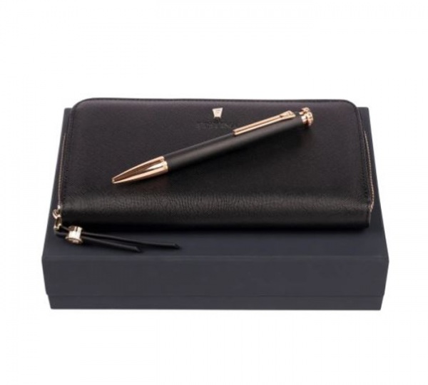 Dámska sada v darčekovom balení obsahuje guľôčkové pero (čierna náplň) a peňaženku.