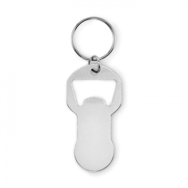 Prívesok na kľúče s otváračom na fľaše vyrobený z recyklovaného hliníka so železným krúžkom.