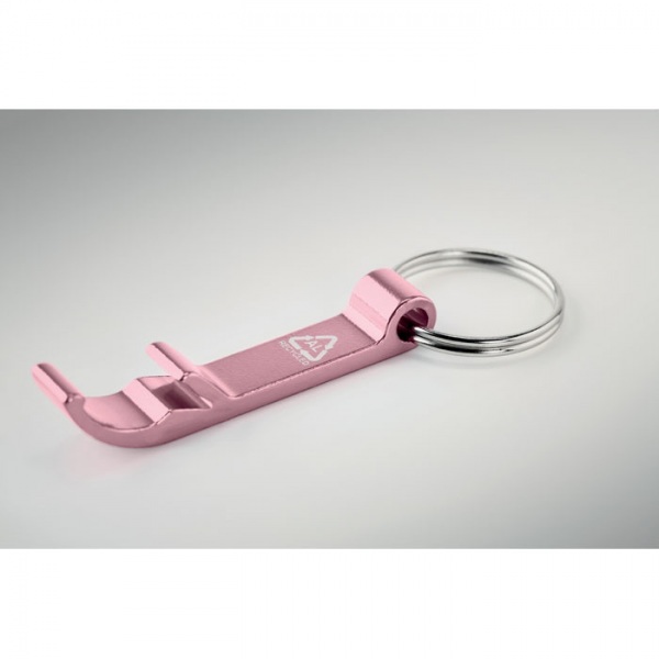 Otvárač na fľaše s kľúčenkou z recyklovaného hliníka s lesklou povrchovou úpravou.