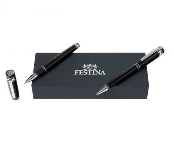 Sada v darčekovom balení obsahuje guľôčkové pero a roller Festina Bold Classic, oboje s čiernou náplňou.