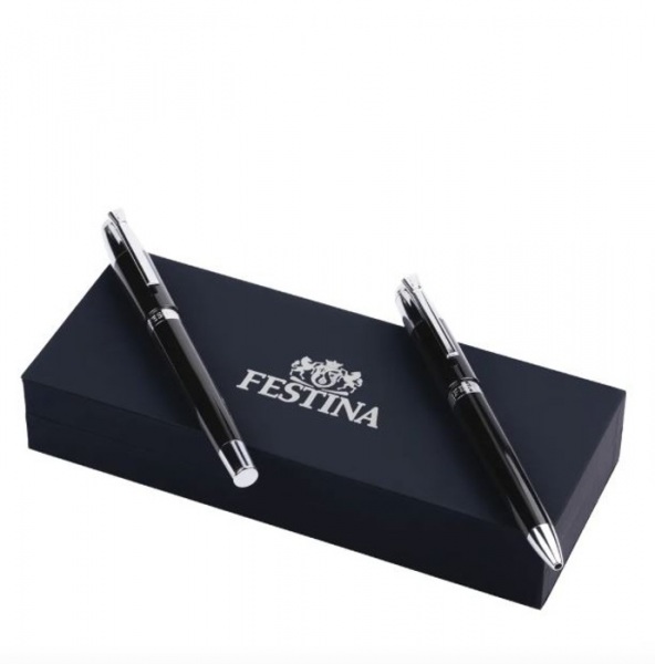 Sada v darčekovom balení obsahuje guľôčkové pero a roller Festina Classicals Chrome, oboje s čiernou náplňou.