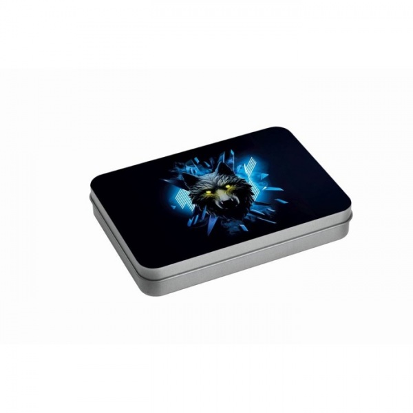 Cestovná sada hracích kariet a kociek Schwarzwolf v plechovej krabičke. Sada obsahuje 2 × 54 hracích kariet s vodeodolnou povrchovou úpravou, 6 kociek, 15 papierikov na poznámky a ceruzku. Balené v darčekovej krabičke.