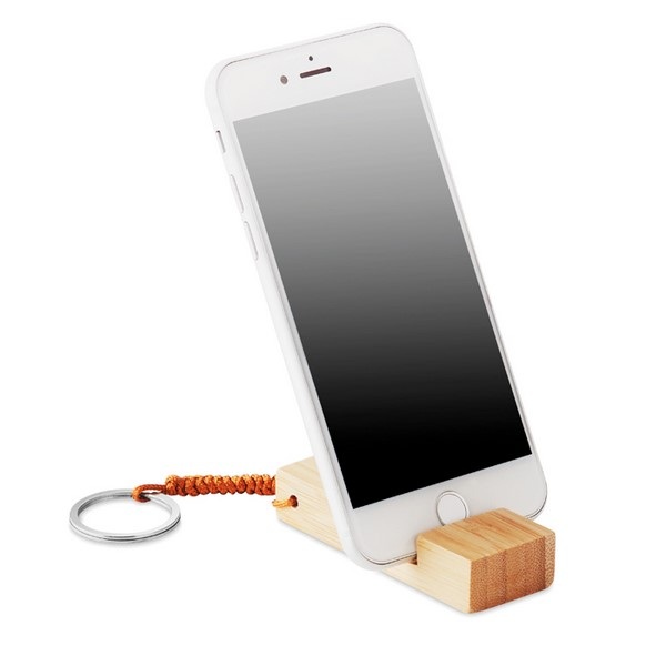 Kľúčenka so stojanom na smartfón z bambusu.