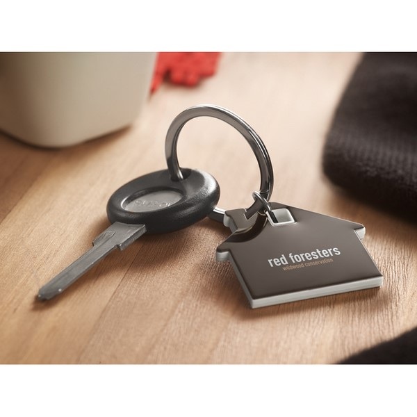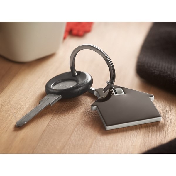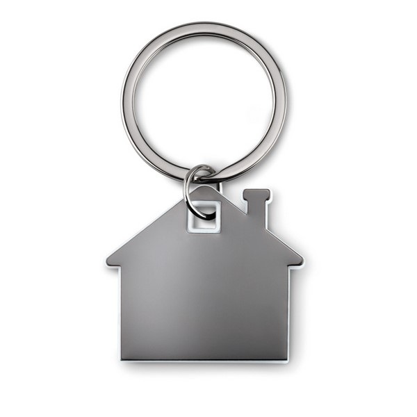 Kľúčenka v tvare domčeka z nerezu a ABS plastu.