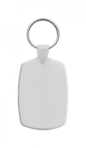 Plastový obdĺžnikový prívesok na kľúče s kovovým krúžkom.