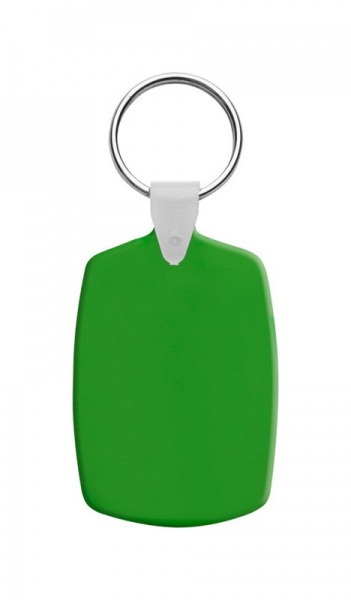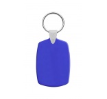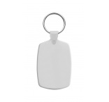 Plastový obdĺžnikový prívesok na kľúče s kovovým krúžkom.