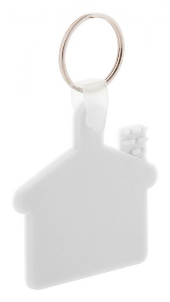 Plastový prívesok v tvare domčeka s kovovým krúžkom.