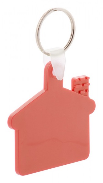 Plastový prívesok v tvare domčeka s kovovým krúžkom.