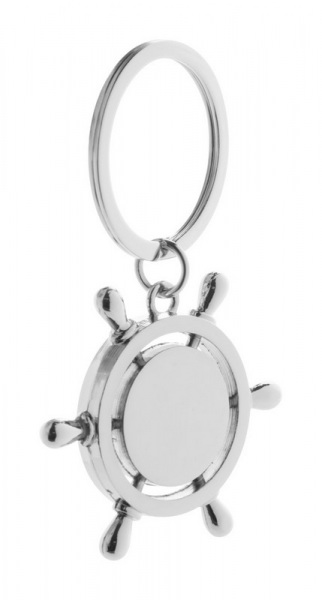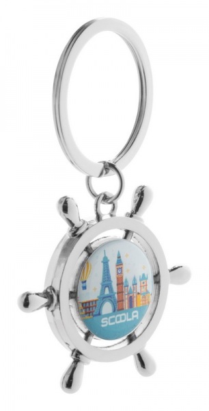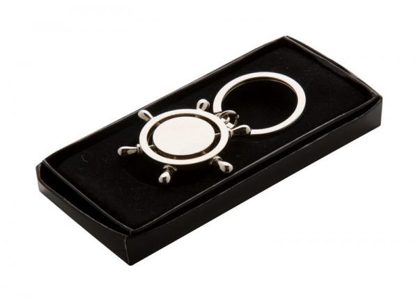 Kovový prívesok na kľúče v tvare kormidla, v čiernej darčekovej krabičke.