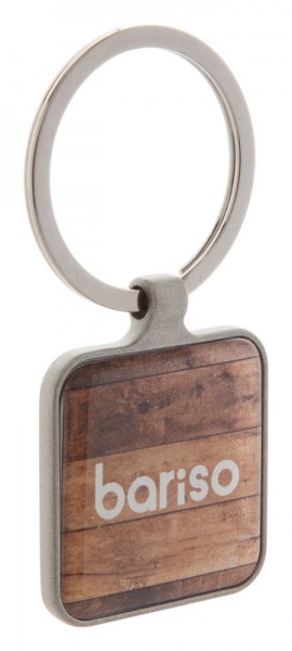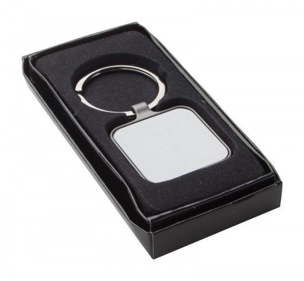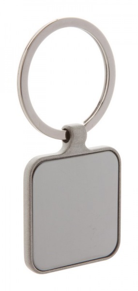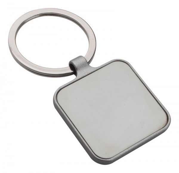 Štvorcový prívesok na kľúče vo farbe gun metal s obojstranným lesklým povrchom.