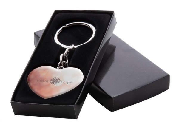 Kovový prívesok na kľúče v tvare srdca, v čiernej darčekovej krabičke.