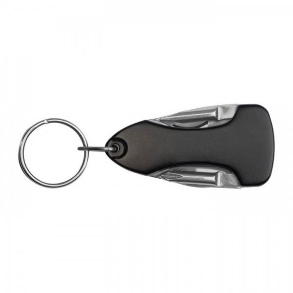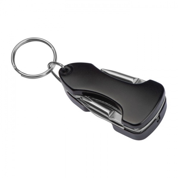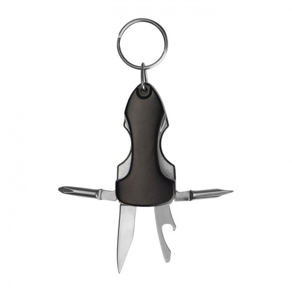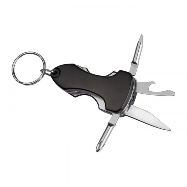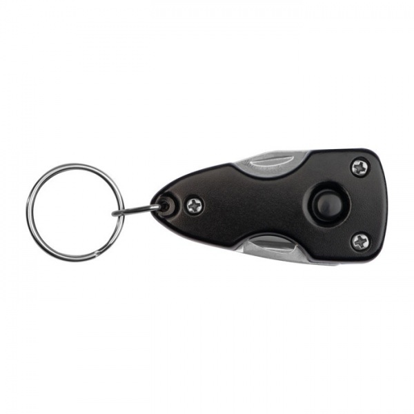 Multifunkčná kľúčenka s LED svetlom, plochým a krížovým skrutkovačom, otváračom na fľaše a kovovým nožom. Obsahuje baterky 2 x CR927