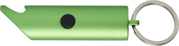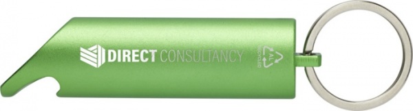 LED kľúčenka s otváračom na fľaše, tlačidlom pre zapnutie/vypnutie a železným krúžkom na kľúče. Je vyrobené z ľahkého a pevného 63% RCS certifikovaného recyklovaného hliníka. Dodáva sa s tromi batériami LR44.