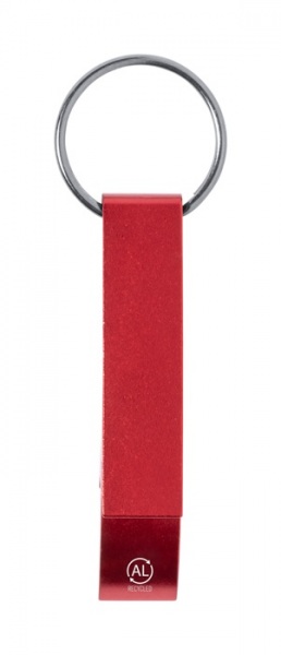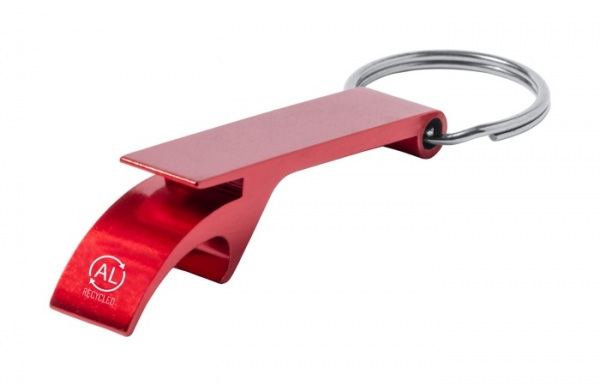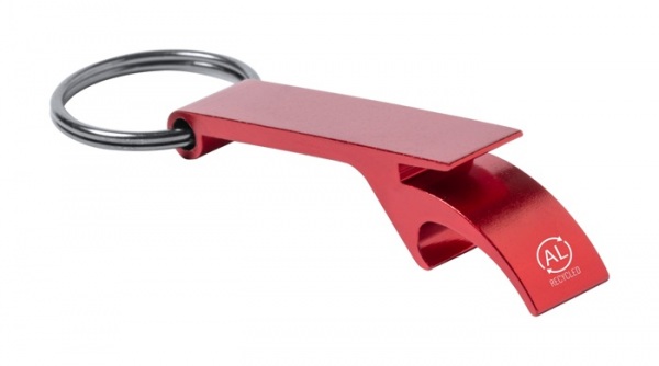 Hliníkový otvárač na fľaše a plechovky s kovovým krúžkom.