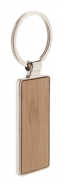 Obdĺžnikový kovový prívesok na kľúče s bambusovou vložkou. Dodávané v papierovej krabičke.