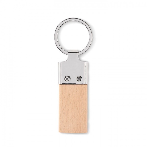 Kľúčenka obdĺžnikového tvaru zo zliatiny zinku s kaučukovým drevom.