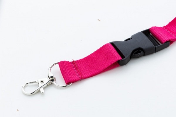 Polyesterový lanyard RPET s odnímateľnou kovovou karabínou a bezpečnostnou prackou.