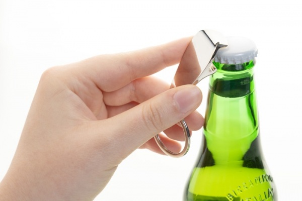 Kovový prívesok na kľúčer s otváračom na fľaše. V kraftovej papierovej krabičke.