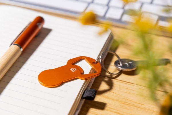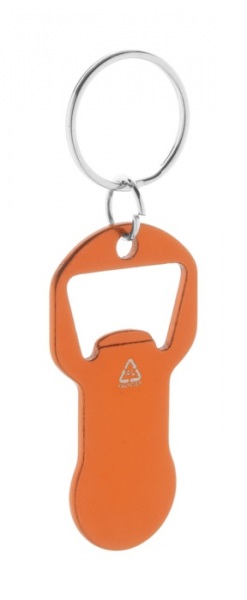 Prívesok na kľúče s otváračom na fľaše z recyklovaného hliníka so žetónom do nákupného vozíka.