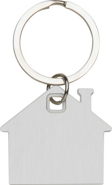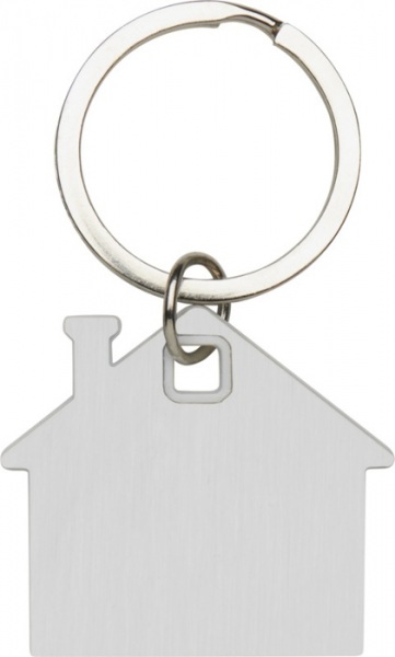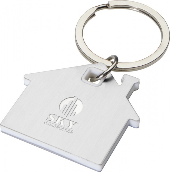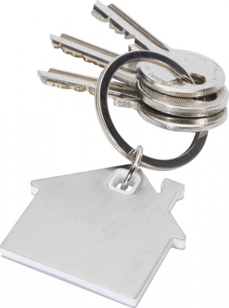 Kľúčenka v tvare domu s nerezovou doštičkou s matným efektom vpredu aj vzadu a farebným plastovým čipom uprostred.