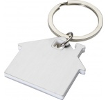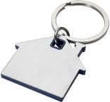 Kľúčenka v tvare domu s nerezovou doštičkou s matným efektom vpredu aj vzadu a farebným plastovým čipom uprostred.