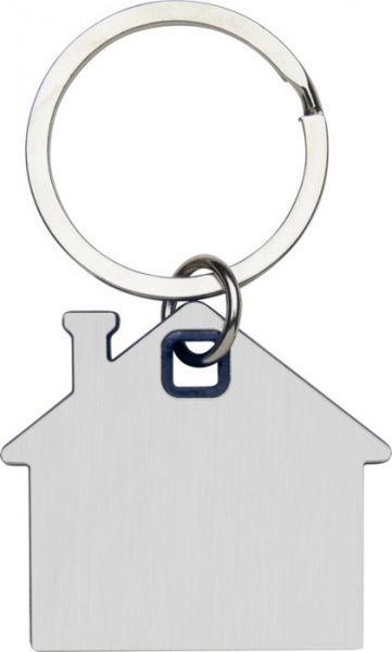 Kľúčenka v tvare domu s nerezovou doštičkou s matným efektom vpredu aj vzadu a farebným plastovým čipom uprostred.