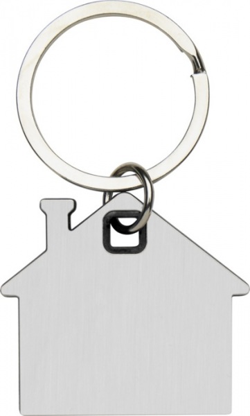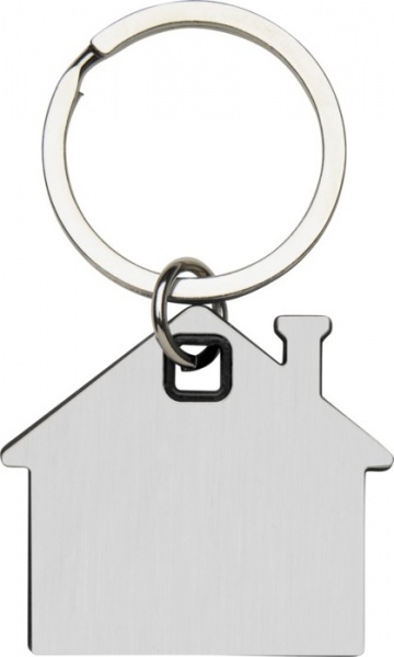 Kľúčenka v tvare domu s nerezovou doštičkou s matným efektom vpredu aj vzadu a farebným plastovým čipom uprostred.