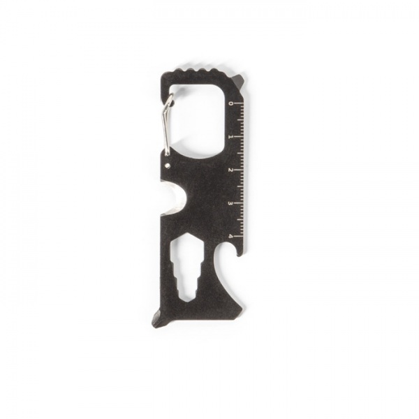 Multifunkčná karta z nehrdzavejúcej ocele. Obsahuje 8 funkcií: pílka, rezačka, kľúč, skrutkovač, krížový skrutkovač, meradlá, otvárač fliaš a prívesok na kľúče