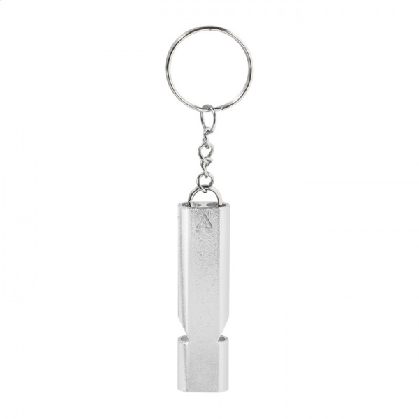 Píšťalka z recyklovaného hliníka s kovovým krúžkom na kľúče.