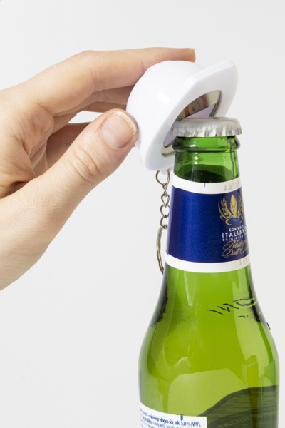 Prívesok na kľúče v tvare bezpečnostnej prilby z recyklovaného ABS materiálu s otváračom na fľaše.